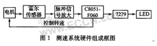 本系統(tǒng)采用單片機C8051F060作為主控制器,使用霍爾傳感器測量電機的轉速,通過7079最終在LED上顯示測試結果。此外,還可以根據(jù)需要調整控制電機的轉速,硬件組成由圖1所示。