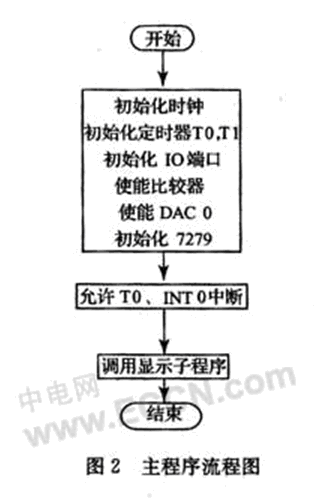 控制器C8051F060主要完成轉速脈沖的采集、16為定時計數(shù)器計數(shù)定時、運算比較,片內集成的12位DAC0控制轉速,并且通過7279顯示接口芯片實現(xiàn)數(shù)碼顯示等多項功能。系統(tǒng)采用外部晶振,系統(tǒng)時鐘SYSCLK等于18432000,T0定時1 ms,初始化時TH0=(-SYSCLK/1 000)》8;TL0=-SYSCLK/1 000。等待1 s到,輸出轉速脈沖個數(shù)N,計算電機轉速值。將1 s內的轉速值換算成1 min內的電機轉速值,并在LED上輸出測量結果。