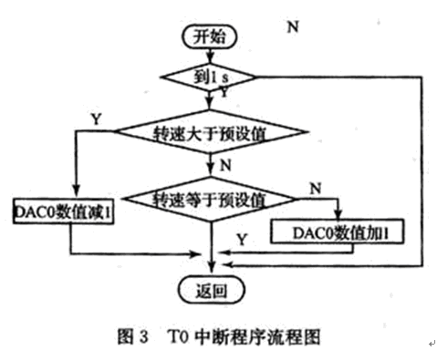 本系統(tǒng)采用C8051F060中的INT0中斷對轉速脈沖計數(shù)。定時器T1工作于外部事件計數(shù)方式對轉速脈沖計數(shù);T0工作于定時器方式均工作于方式1。每到1 s讀一次計數(shù)值,此值即為脈沖信號的頻率,根據(jù)式(1)可計算出電機的轉速。由于直流電機的轉速與施加工于電機兩端的電壓大小有關,故將實際測得的轉速值與預設的轉速值比較,若大于預設的轉速值則減小DAC0的數(shù)值,若小于轉速預設的轉速值則增加DAC0的值調整電機的轉速,直到轉速值等于預設定的值,這樣就實現(xiàn)了對電機轉速的控制,主程序和T0中斷流程圖如圖2、3所示。