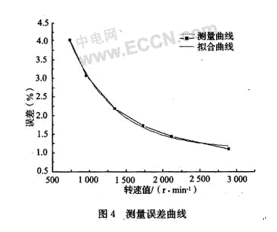 首先在軟件中給出轉速預設值,即給定常量speed的值,觀察速度穩(wěn)定后七段數(shù)碼管的數(shù)值,比較實際測量的轉速值和預設轉速值,計算測量誤差,評價測量的準確性,測試結果如表1所示。根據(jù)實驗測試和誤差分析繪制了測量誤差曲線,如圖4所示。誤差分析表明,轉速測量誤差在5%以內,并且隨著轉速預設值的增加測量誤差愈小,呈指數(shù)形式下降,函數(shù)關系如式(3)所示。