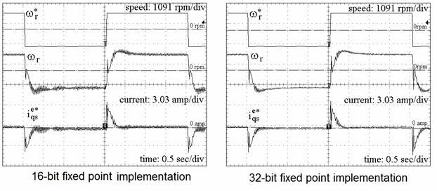 比例積分控制器的積分項總是采用 32 位字長甚至是 16 位定點版本,根據(jù)以往的經(jīng)驗,采用 16 位積分累加的結(jié)果明顯地差的多。采用類似仿真的策略將 ±0.5 pu 的步長應(yīng)用于系統(tǒng)速度參考。d 軸及 q 軸電流和估測速度作為速度命令的步長,這些也證實了仿真結(jié)果。在瞬態(tài)及穩(wěn)態(tài)狀態(tài)下,仿真結(jié)果的響應(yīng)相關(guān)性很強。不良振蕩瞬態(tài)及因采用 16 位實施造成的瞬態(tài)時間增加等情況下的量化效應(yīng)是可以驗證的。