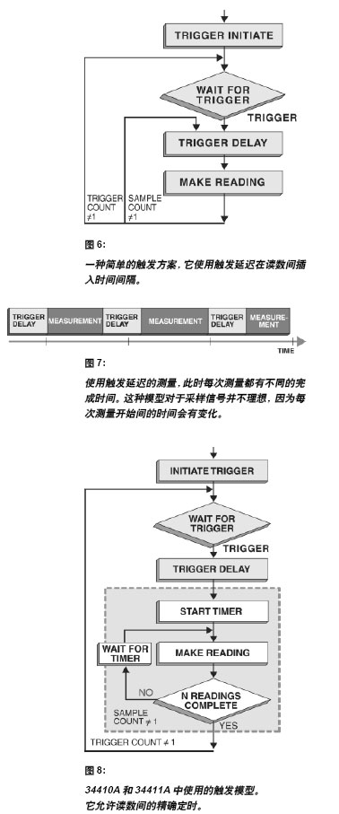 圖8示出第二種觸發模型。這是在34410A、34411A 和3458A 中使用的模型。它允許獨立設置觸發延遲和采樣間的時間。此外,用采樣環(n個讀數)可更快地得到讀數和實現最小的時間變動量。大多數采樣環在硬件中實現,由最少的固件