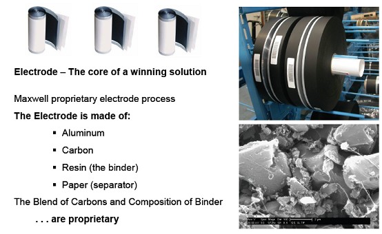 超級電容器的面積來自一個多孔的碳基電極材料。這種材料的多孔結構,允許其面積接近2000平方米每克,遠遠大于通過使用塑料或薄膜陶瓷。超級電容器的充電距離取決于電解液中被吸引到電極的帶電離子的大小。這個距離(小于10埃)遠遠小于通過使用常規電介質材料的距離。巨大的表面面積的組合和極小的充電距離使超級電容器相對傳統的電容器具有極大的優越性。