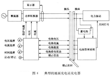圖3為一典型的地面充電站中充電器的方案,該充電器由一個能將輸人的交流電轉(zhuǎn)換為直流電的整流器和一個能調(diào)節(jié)直流電功率的功率轉(zhuǎn)換器組成,通過把帶電線的插頭插入電動汽車上配套的插座中,直流電能就輸入蓄電池對其充電。充電器設(shè)置了一個鎖止杠桿以利于插入和取出插頭,同時杠桿還能提供一個確定已經(jīng)鎖緊的信號以確保安全。根據(jù)充電器和車上電池管理系統(tǒng)相互之間的通訊,功率轉(zhuǎn)換器能在線調(diào)節(jié)直流充電功率,而且充電器能顯示充電電壓、充電電流、充電量和充電費(fèi)用等。
