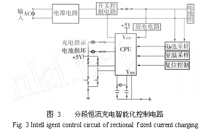 分段恒 流 充 電 智 能 化 控 制 電 路 如 圖3 所示。該電路采用 CPU 控制 ,可對充電電池和充電環境溫度進行檢測 ,對電池充電進行計時 ,采樣充電過程中電池的電壓和電流 ,對分段恒流充