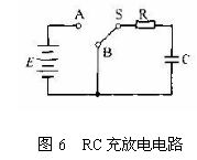 RC充放電電路如圖6所示。圖中開關S原來停留在B點位置,電容器C上沒有電荷,它兩端的電壓等于零。當開關接到A點時.電源E通過R向電容器 C充電,在電路接通的瞬間,電容器電壓Vc=0,充電電流最大值等于Z/R。隨著電容器兩極上電荷的積累,Vc逐漸增大,電阻器R上的電壓Vr =E -Vc,充電電流i=(E—Vc)/R且隨著Vc的增大而越來越小,Vc的上升也越來越慢。當Vc=E時,i=0,充電過程結束。