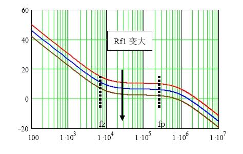 因此,當(dāng)補償網(wǎng)絡(luò)進入系統(tǒng)環(huán)路之后,Rf1的作用是使環(huán)路增益的幅頻特性上下平移,同時環(huán)路增益的相頻特性保持不變。