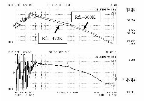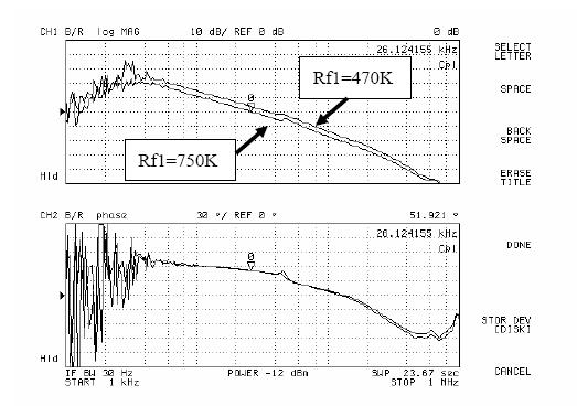 圖5和圖6是用網(wǎng)絡(luò)分析儀進行AP3406環(huán)路增益測試的結(jié)果。由圖可以看出,當(dāng)Rf1從300k變化到470k,再變化到750k,系統(tǒng)的環(huán)路增益的幅頻特性不斷向下移動,同時相頻特性基本不變。于是系統(tǒng)的帶寬和相位裕度都有較大改變,測試結(jié)果如表1所示。