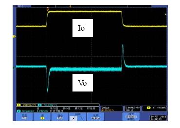 系統(tǒng)的帶寬是影響系統(tǒng)動態(tài)響應(yīng)的重要因素,相位裕度是影響系統(tǒng)穩(wěn)定性的重要因素。如果選擇不同的Rf1,系統(tǒng)的帶寬和相位裕度會產(chǎn)生變化,也就是動態(tài)響應(yīng)和穩(wěn)定性會發(fā)生變化。具體以表1來分析,當(dāng)Rf1從300k變到750k,系統(tǒng)地帶寬從51.1kHz變到26.1kHz,因此系統(tǒng)的動態(tài)響應(yīng)會相應(yīng)的變差,而由于相位裕度都是足夠的,因此系統(tǒng)都處于穩(wěn)定工作的狀態(tài)。圖7和圖8是做負載切換的動態(tài)響應(yīng)測試結(jié)果,從測試結(jié)果可以看出環(huán)路響應(yīng)速度變慢,導(dǎo)致輸出電壓過沖變大,動態(tài)響應(yīng)效果變差。