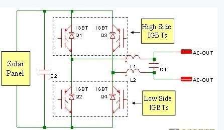 本文分析了太陽(yáng)能逆變器應(yīng)用的全橋拓?fù)洹_@種拓?fù)淅谜颐}寬調(diào)制技術(shù),在高于20kHz情況下,為高壓側(cè)IGBT 進(jìn)行轉(zhuǎn)換。支線的低壓側(cè)IGBT決于輸出頻率要求,在50Hz或60Hz進(jìn)行轉(zhuǎn)換。若挑選最新的600V槽柵IGBT,其總功耗將會(huì)在20kHz下達(dá)到最低。在低壓側(cè)IGBT方面,標(biāo)準(zhǔn)速度平面式IGBT是最佳選擇。標(biāo)準(zhǔn)速度IGBT在50Hz或60Hz下?lián)碛凶畹偷膶?dǎo)通損耗,其開關(guān)損耗對(duì)整體功耗來(lái)說微不足道。因此,工程師只要正確選擇IGBT組合, 就能將太陽(yáng)能逆變器應(yīng)用的功耗降至最低。