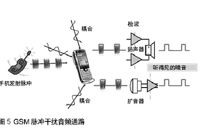 當(dāng)手機(jī)與基站通訊,或兩個(gè)手機(jī)彼此接近時(shí),發(fā)射脈沖通過(guò)擴(kuò)音器,揚(yáng)聲器,或頭戴式耳機(jī)線(xiàn)傳人音頻通路。見(jiàn)圖5。