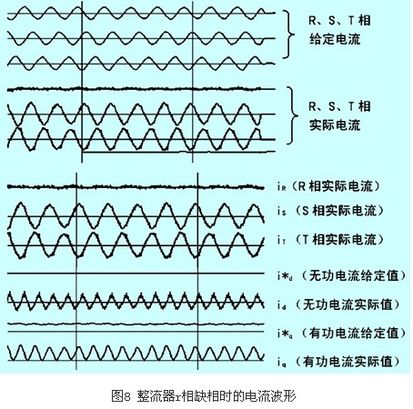 如果由于線路缺相,CT也檢測(cè)不到電流(例如r相電流ir=0),則由于平衡控制會(huì)使另外兩相電流的相位差變?yōu)?80°,幅值相等(當(dāng)然為補(bǔ)償“缺相”的那相電流,另兩相電流將增大),以滿足矢量和為零的控制要求,如圖8所示。此時(shí),根據(jù)r、s、t相實(shí)際電流計(jì)算出的有功分量電流iq和無(wú)功分量電流id已經(jīng)不是正常直流量,而是含有2倍頻(相電流頻率)成份的交流量,參見(jiàn)圖8,整流器無(wú)法正常工作。