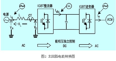 鑒于整流器和逆變器相互之間是分別獨(dú)立運(yùn)行的,它們是分別獨(dú)立可控的,能對(duì)整流器的功率因數(shù)進(jìn)行獨(dú)立控制,而不受馬達(dá)負(fù)荷及運(yùn)轉(zhuǎn)速度的影響,如圖2所示。