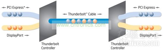 Thunderbolt接口由一顆Intel控制芯片驅(qū)動(dòng),通過PCI-E x4、DisplayPort總線與系統(tǒng)芯片組相連,也可以直接連接Intel處理器內(nèi)集成的圖形核心進(jìn)行DisplayPort輸出。
