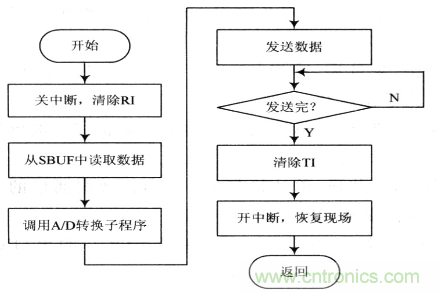 由于單片機多應用于實時性較強的控制場合,為了盡量少占用CPU的時間,充分發揮CPU的功能。該系統在單片機程序設計中采用中斷方式與PC機進行通信。主程序只進行串行通信、數碼管實時顯示、模/數轉換結果的初始化和循環等待串行中斷工作,當接收到PC機發來的信號時,就轉人中斷服務程序,進行A/D轉換,并向Pc機發送數據。中斷服務子程序流程圖如圖6所示。