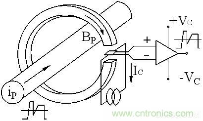 開環(huán)霍爾電流傳感器基于直測式霍爾原理,即開環(huán)原理(也稱只測試霍爾),原邊電流IP產(chǎn)生的磁通被高品質(zhì)磁芯聚集在磁路中,霍爾元件固定在很小的氣隙中,對磁通進(jìn)行線性檢測,霍爾器件輸出的霍爾電壓經(jīng)過特殊電路處理后,副邊輸出與原邊波形一致的跟隨輸出電壓,此電壓能夠精確反映原邊電流的變化。原理圖及外形如下: