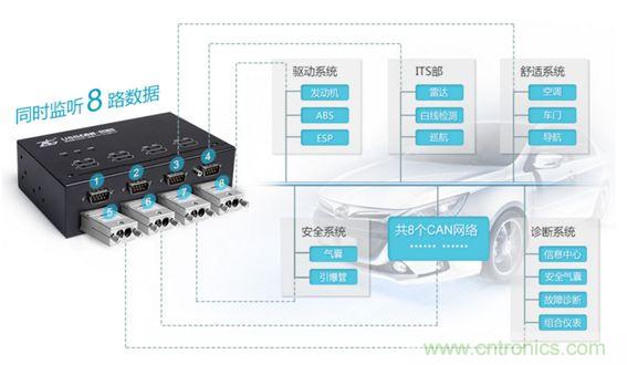 若將每個節點單獨取出做測試,則必然破壞原有通信規則。如何在不破壞原有通信的基礎上搞清楚一個陌生的收發協議呢?所謂工欲善其事,必先利其器。您需要一個能同時收發、轉送多路CAN數據的CAN卡,USBCAN-8E-U正是為這種應用而生。