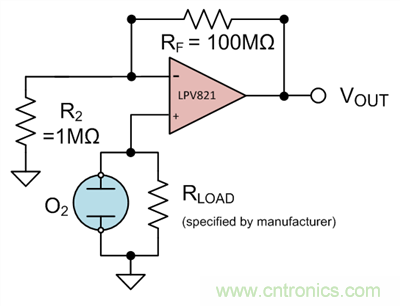 用氧氣傳感(見圖 3) 作為具體的應(yīng)用實(shí)例,假設(shè)感應(yīng)器的最大輸出電壓為10mV(通過制造商指定的負(fù)載電阻將電流轉(zhuǎn)換成電壓R_L) ,則運(yùn)算放大器的滿量程輸出電壓為1V。通過Equation 2,可以看出 A_CL  的值需要為100,或者R_F是R_2的100倍。分別選擇100MΩ電阻和1MΩ電阻,得出增益值為101,且電阻值足夠大到可以限制電流并最小化功耗。