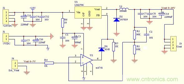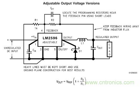 如果我們能夠設計出一種可以用電壓調節輸出的開關穩壓電路,然后用DAC來控制調節電壓,那么就很容易實現。問題是我們不可能自己重新設計一個DC-DC,如果能把現成的DC-DC集成芯片,通過修改外圍電路的方式,來實現用電壓來控制輸出,那么問題就得到解決。下面,我還是以LM2596-Adj為例,看看怎樣把LM2596-Adj改裝成可數控的開關穩壓電源。