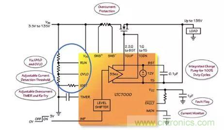 LTC7000 能夠避免負載遭受 VIN 引腳上的過壓和欠壓情況的損壞。“一個連接在 VIN 和地之間、且抽頭連接至 RUN 和 OVLO 引腳的簡單電阻分壓器將設定一個針對負載的有效操作窗口。當 VIN 位于由 RUN 和 OVLO 引腳所設定的操作窗口之外時,則關斷外部 MOSFET,并保護負載免遭潛在損壞或發(fā)生故障。” Mark Mullen這樣談到。