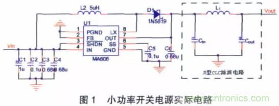 設計電路如圖1 所示,測試時輸入端使用3.6 V 的鋰電池進行供電,使用π 型CLC 低通濾波電路對MAX606 輸出端進行紋波濾波。