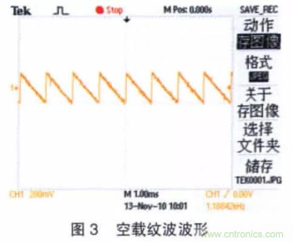 圖3 所示為空載時MAX606 輸出電壓紋波波形(Uo≈12 V),即開關紋波,其頻率為1.18 kHz,波形穩定,Vpp=240 mV。圖4 所示為負載120 Ω 時輸出電壓的紋波波形,從圖4 中可以看出加入負載后電源紋波變得比較復雜,其最高Vpp達到1.2 V。為系統供電時,該紋波將會對系統造成嚴重危害,必須對此紋波進行抑制。