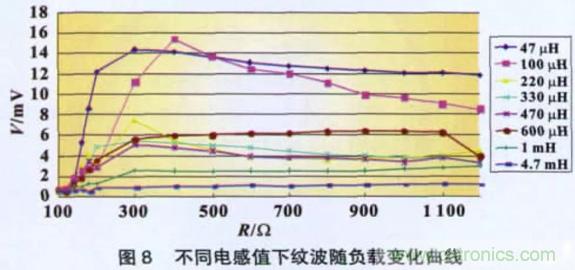 電容固定(貼片鉭電解220 μF/16 V),改變圖1 中CLC 濾波電路的電感值大小,測量不同負載時紋波的有效值,得到如圖8 所示的曲線圖,其中電感使用的是弓形電感。