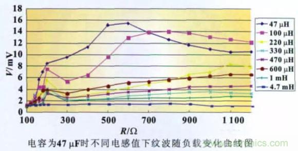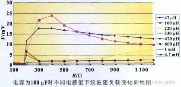 2.2.3 不同電感值下紋波隨負載的變化