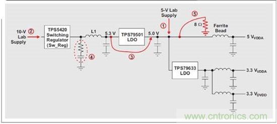 實(shí)驗(yàn) 2—將一個(gè) 10-V 實(shí)驗(yàn)室電源連接到 TPS5420 降壓穩(wěn)壓器,其使用一個(gè)5.3-V 輸出。這樣可為 TPS79501 提供一個(gè) 300-mV 壓降,從而生成一個(gè) 5-V電壓軌。