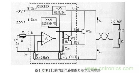 XTR115采用SO-8小型化封裝,其內部電路框圖及基本應用電路如圖1所示。U+為電源端,接環路電源。UREF為2.5V基準電壓輸出端。II端接輸入電流。IRET為基準電壓源輸出電流和穩壓器輸出電流的返回端,可作為輸入電路的公共地。OUT為4~20mA電流輸出端。UREG為+5V穩壓器的輸出端。B和E端為外部功率管的接口,分別接功率管的基極(B)和發射極(E)。功率管的集電極(C)接U+端。芯片內部主要包括輸入放大器(A),電阻網絡,輸出晶體管(VT1),2.5V基準電壓源和+5V穩壓器。RLIM為內部限流電阻。外圍元器件主要有輸入電阻(RI),功率管(VT2),環路電源(Us)和負載電阻(RL)。輸入電壓UI先經過RI轉換成輸入電流II,再經過XTR115放大后從OUT端輸出4~20mA的電流信號。為減小失調電壓以及輸入放大器的漂移量,要求UI》0.5V