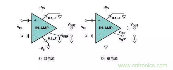 類似的問題也會出現在儀表放大器電路中。圖3示出了使用兩只電容器進行AC耦合的儀表放大器電路,沒有提供輸入偏置電流的返回路徑。這個問題在使用雙電源(圖3a)和單電源(圖3b)供電的儀表放大器電路中很常見。