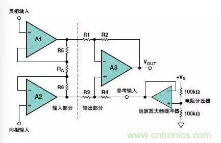 圖9.利用低輸出阻抗運算放大器驅動儀表放大器的參考電壓輸入端