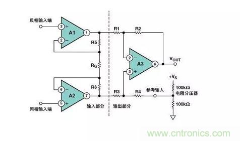 例如,流行的儀表放大器設計配置使用上圖所示的三運放結構。其信號總增益為