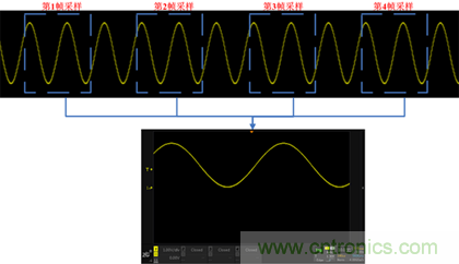 示波器的觸發(fā)條件的一個很關(guān)鍵的因素是觸發(fā)電平,觸發(fā)電平大多數(shù)情況下是用一根直流電平作為基準(zhǔn),當(dāng)信號的電壓超過該直流電平的時刻作為采樣波形的起始點。由于起始采樣的位置是有規(guī)律的,因此多次采樣的波形進行疊加后看上去還是一個穩(wěn)定的波形。如圖3所示: