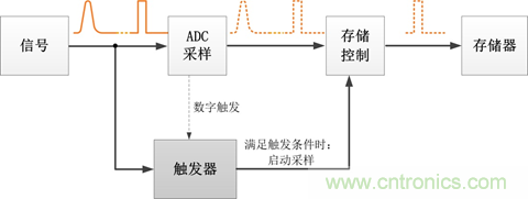 這就要靠觸發(fā)系統(tǒng)來實現(xiàn)。觸發(fā)的原理是一直監(jiān)控信號流,若發(fā)現(xiàn)信號滿足設(shè)定的觸發(fā)條件,觸發(fā)器記錄滿足條件的信號,啟動采樣;待數(shù)據(jù)采集完畢后,由控制器對信號進行處理和顯示。具體如圖2所示。