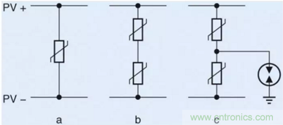 額定電壓為1000 V DC的金屬氧化物壓敏電阻通常用于太陽能逆變器的直流輸入。根據(jù)待處理線路電壓,例如電壓為300 VRMS的壓敏電阻可以是變頻器輸出的首選。在這兩種情況下,也可使用充氣式氣體放電管以實現(xiàn)額外防護。圖2為太陽能逆變器直流輸入的常用電路設計:最簡化版本(圖2a)僅使用一個額定電壓為1000 VRMS的壓敏電阻(例如片狀,直徑20毫米)。在這種情況下,額定直流電壓為1414 V DC,而鉗位電壓在100 A時為2970 V。圖2b所示電路通過串聯(lián)的兩個壓敏電阻運作,兩元件應專用于550 VRMS (745 V DC),以提供相同保護。這一設計提供了一大優(yōu)點:鉗位電壓在電流為100 A時僅為2710 V,從而進一步抑制過電壓。此外,待吸收能量將平均分布于兩個組件,從而降低負荷系數(shù)。圖2c所示電路則在壓敏電阻與地面之間添加了一個氣體放電管。這一設計仍將提供充分保護,特別是當單個或兩個壓敏電阻出現(xiàn)故障或因負荷導致老化時。必須使用氣體放電管,以免當兩個壓敏電阻同時故障時進入持續(xù)導電狀態(tài)。