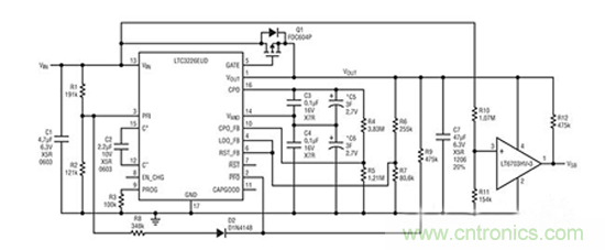 圖 1 示出了一款采用超級電容器組的電源保持系統,該電容器組在沒有電池電源的情況下提供持續約45s 的 165mW 待機功率的容量。一個 LDO 負責在后備模式期間將超級電容器組的輸出轉換為一個恒定電壓電源。