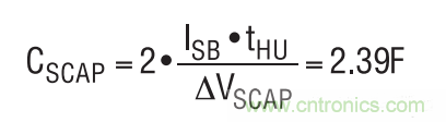 在后備模式中,當超級電容器組上的電壓開始接近VOUT 時,在計算 tHU 結束時超級電容器上的最小電壓必須將兩個超級電容器的 ESR 和 LDO 的輸出電阻考慮在內。假設每個超級電容器的 ESR 為 100mΩ,而 LDO 輸出電阻為 200mΩ,這將由于 50mA 待機電流的原因而使VOUT (MIN)增加20mV。VOUT (MIN)設定為3.1V,從而在超級電容器組上產生一個1.88V的放電電壓 (?VSCAP)?,F在,可以確定每個超級電容器的大小。