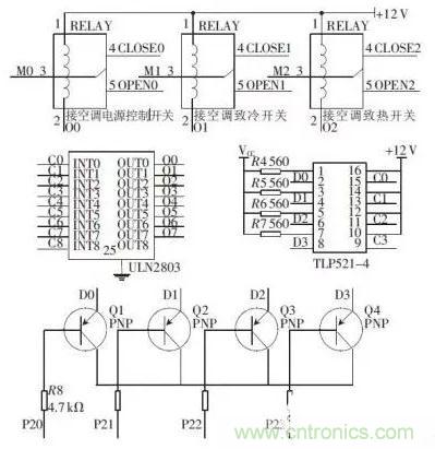 繼電器開關模塊由TLP521 -4 、ULN2803 和SRD -12VDC 及三極管構成,由微控制器輸出的信號經過三極管構成的開關電路送往TLP521 -4 光耦芯片再通過ULN2803 達林頓管的放大后用來驅動SRD-12DC 繼電器,進而達到控制空調的各種開關的作用, 繼電器開關控制模塊與微控制器的電路連接圖如圖3 所示。