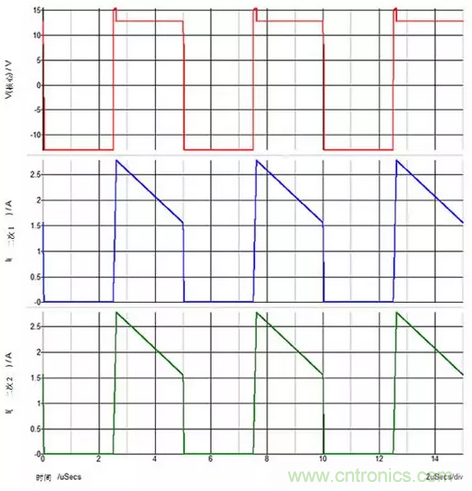 圖2:當對兩個輸出施加重載時,在整個1-D周期內,次級繞組電流在兩個次級繞組中流動。您可以看到上方紅色跡線上的基座電壓。