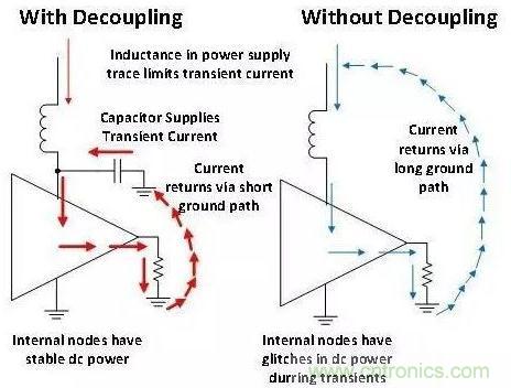 圖 2 闡述了為什么去耦非常重要。需要注意的是,電源線跡的電感將限制暫態電流。 去耦電容與器件非常接近,因此電流路徑的電感很小。在暫態過程中,該電容器可在非常短的時間內向器件提供超大量的電流。 未采用去耦電容的器件無法提供暫態電流,因此放大器的內部節點會下垂(通常稱為干擾)。無去耦電容的器件其內部電源干擾會導致器件工作不連續,原因是內部節點未獲得正確的偏置。