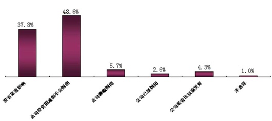 一個公司能否健康地發(fā)展,領(lǐng)導(dǎo)層的作用至關(guān)重要。常言道,滄海橫流方顯英雄本色,在經(jīng)濟(jì)牛市中,考驗(yàn)的是企業(yè)決策人的遠(yuǎn)見和膽識,在經(jīng)濟(jì)熊市中,就更需要企業(yè)領(lǐng)導(dǎo)層的聰明才智。此次調(diào)查顯示,超過64.3%的電子工程師給了自己的企業(yè)領(lǐng)導(dǎo)層很正面的評價(jià),從這個結(jié)果來看,我們的電子行業(yè)的工作和諧程度還是較高的!
