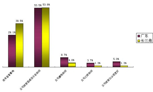 此項(xiàng)調(diào)查結(jié)果出乎我們的意料,選擇裁員的企業(yè)已經(jīng)占到了20.8%,但是多數(shù)企業(yè)還是選擇了調(diào)整經(jīng)營策略。我們特別希望有遠(yuǎn)見的企業(yè)不要把裁員作為應(yīng)對危機(jī)的主要措施,這也不符合我們“和諧社會”的主旋律。只要能正確的面對,認(rèn)真分析企業(yè)的優(yōu)勢,研究市場的動向,合理配置企業(yè)資源,充分發(fā)揮員工的潛力,調(diào)動員工的積極性,企業(yè)一定會有新的轉(zhuǎn)機(jī)。企業(yè)如能和員工共克時(shí)艱,就會加深員工對企業(yè)的感情,這種情感會轉(zhuǎn)化為企業(yè)的一種優(yōu)勢資源。(見圖表四)