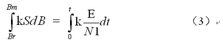 上式中,k是一個(gè)與單位制相關(guān)的系數(shù),S為變壓器鐵心的導(dǎo)磁面積,B為磁感應(yīng)強(qiáng)度,也稱磁通密度,即:單位面積的磁通量。把(2)式代入(1)式,并進(jìn)行積分: