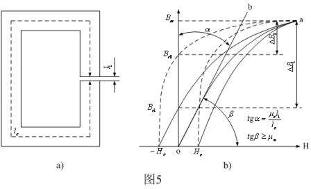 圖5-b) 中,虛線是沒留有氣隙變壓器鐵芯的磁化曲線,實(shí)線是留有氣隙變壓器鐵芯的磁化曲線;曲線b是留有氣隙變壓器鐵芯的等效磁化曲線,其等效導(dǎo)磁率,即曲線的斜率為