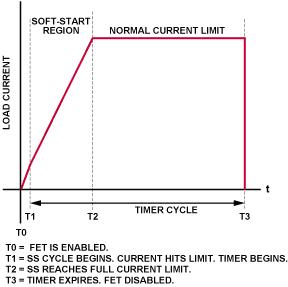 利用軟啟動(dòng),浪涌電流在軟啟電容設(shè)定的期間可以從零線性增加到滿量程。通過(guò)逐步提高基準(zhǔn)電流,能避免浪涌電流突然達(dá)到30 A的限制。需要注意的是,在軟啟過(guò)程中,電流處于調(diào)整過(guò)程中,因此,定時(shí)器從軟啟動(dòng)開(kāi)始之際就進(jìn)入工作狀態(tài),如圖5所示。