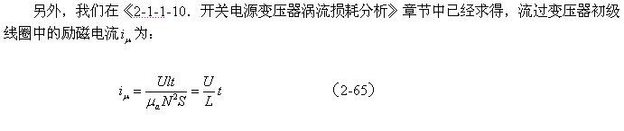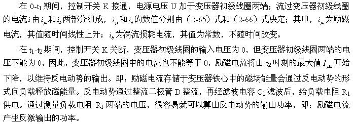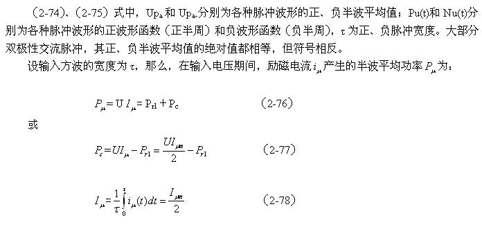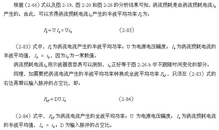 順便指出:(2-84)式的結果,是認為渦流損耗在t1-t2期間(圖2-26-b)完全等于0而求得的,但實際上,在t1-t2期間變壓器初級線圈產生的反電動勢同樣也會在變壓器鐵芯中感應產生渦流損耗電流,即當輸入電壓為0時刻,在變壓器鐵芯中還存在很短暫時間的渦流損耗;由于這種渦流損耗是由反電動勢提供能量來維持的,它將隨著反電動勢能量的衰減很快就衰減到0。