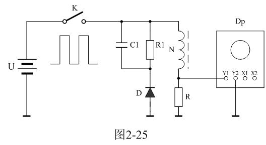 圖2-25中,U是電源電壓,通過控制開關K不斷地接通和關斷,就可以把電源電壓調制成單極性電壓脈沖;N為變壓器初級線圈,D為反激輸出整流二極管;R1為反激輸出負載電阻;C1為濾波電容;R為取樣電阻,通過測量R兩端的電壓,就可以知道流過變壓器初級線圈的電流;取樣電壓被送到示波器Dp進行顯示。
