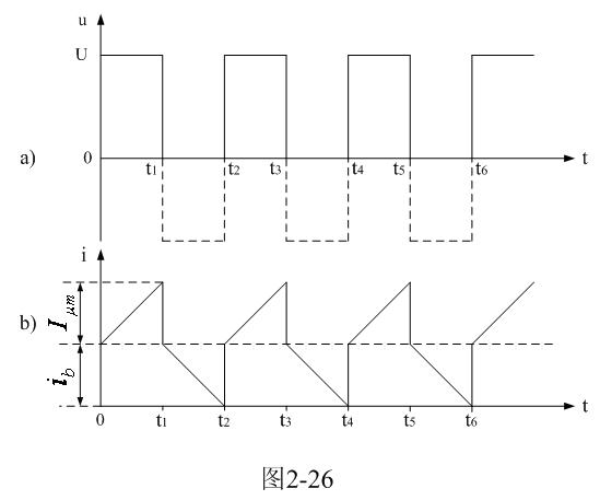 圖2-26是圖2-25電路中變壓器初級線圈兩端電壓以及電流波形圖。圖2-25中,通過改變控制開關K的占空系數,可使變壓器初級線圈正好工作于電流臨界連續(xù)狀態(tài)或電流斷續(xù)狀態(tài),即:流過變壓器初級線圈中的電流在下一次控制開關K接通之前為0。