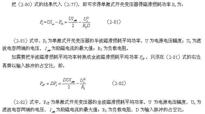 從(2-81)式和(2-82)式還很難看出,單激式開關電源變壓器的磁滯損耗主要與誰相關,因為等式右邊的減數和被減數與輸入電壓、脈沖寬度都有相同變化的趨向。實際上在脈沖寬度固定的情況下,單激式開關電源變壓器的磁滯損耗是很小的,此結果在《開關電源變壓器磁滯損耗分析》的章節(jié)中已經分析過。